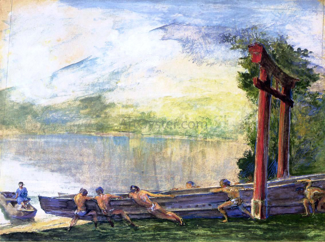 A Torii on Shore of Lake Chusenji, Japan. Fishermen Pushing Out Their Boat by John La Farge - Hand-Painted Oil Painting on Canvas